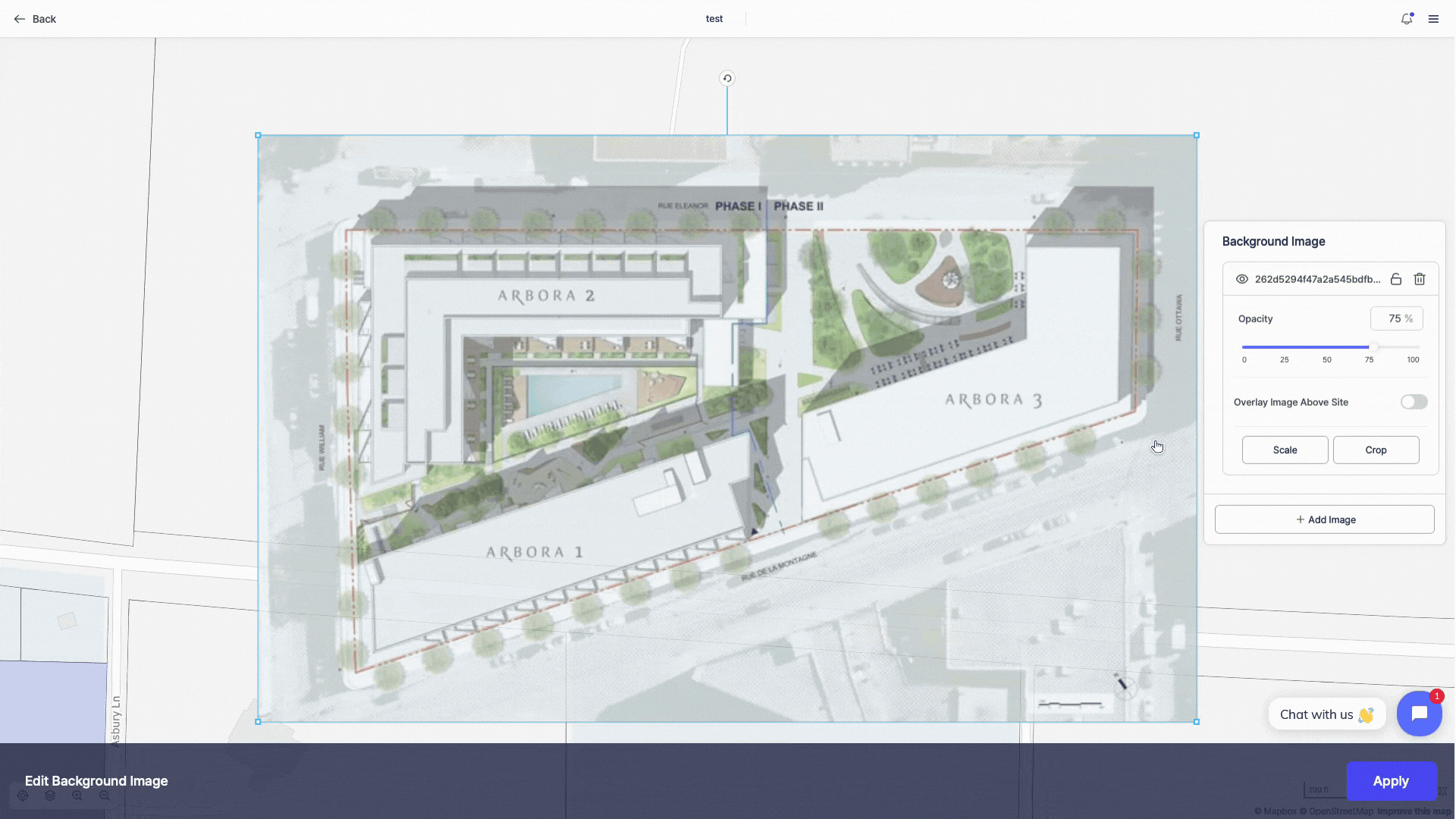 Your image will appear on the map, allowing you to draw your site boundaries according to it or replicate the building layout based on your uploaded image.