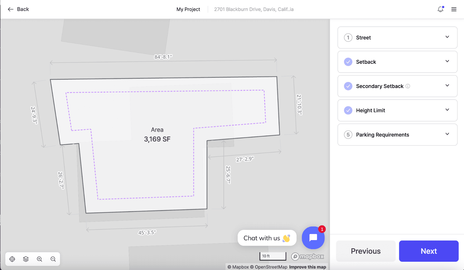Street is where you should click the sides of the site that is facing the street.,Setbacks can be inputted either on the panel or directly on the map. Secondary Setbacks can be configured for the residential buildings on top of a podium.,Height limit can be inputted in case there is a maximum height that should be placed on the building. If you are unsure, you can tick the “unknown” box and leave it blank.,Parking Requirements can be adjusted depending on the jurisdiction’s requirements for your project, and you can choose whether they apply to residential, retail, office, flat minimum, or a combination of several uses.