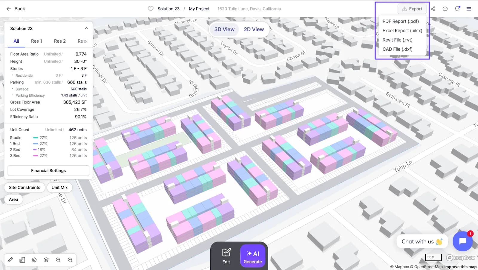 Feel free to choose from the generated designs and click on “See All Details” where you would be redirected to our workspace. In this workspace, you are free to edit the generated design however you like, from changing building and unit layouts to adding another building, parking structure, specialty zones. Here is a little more details about the components that you can add to your design using our app: