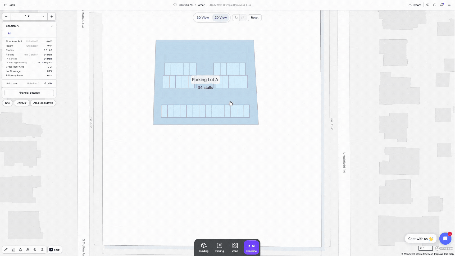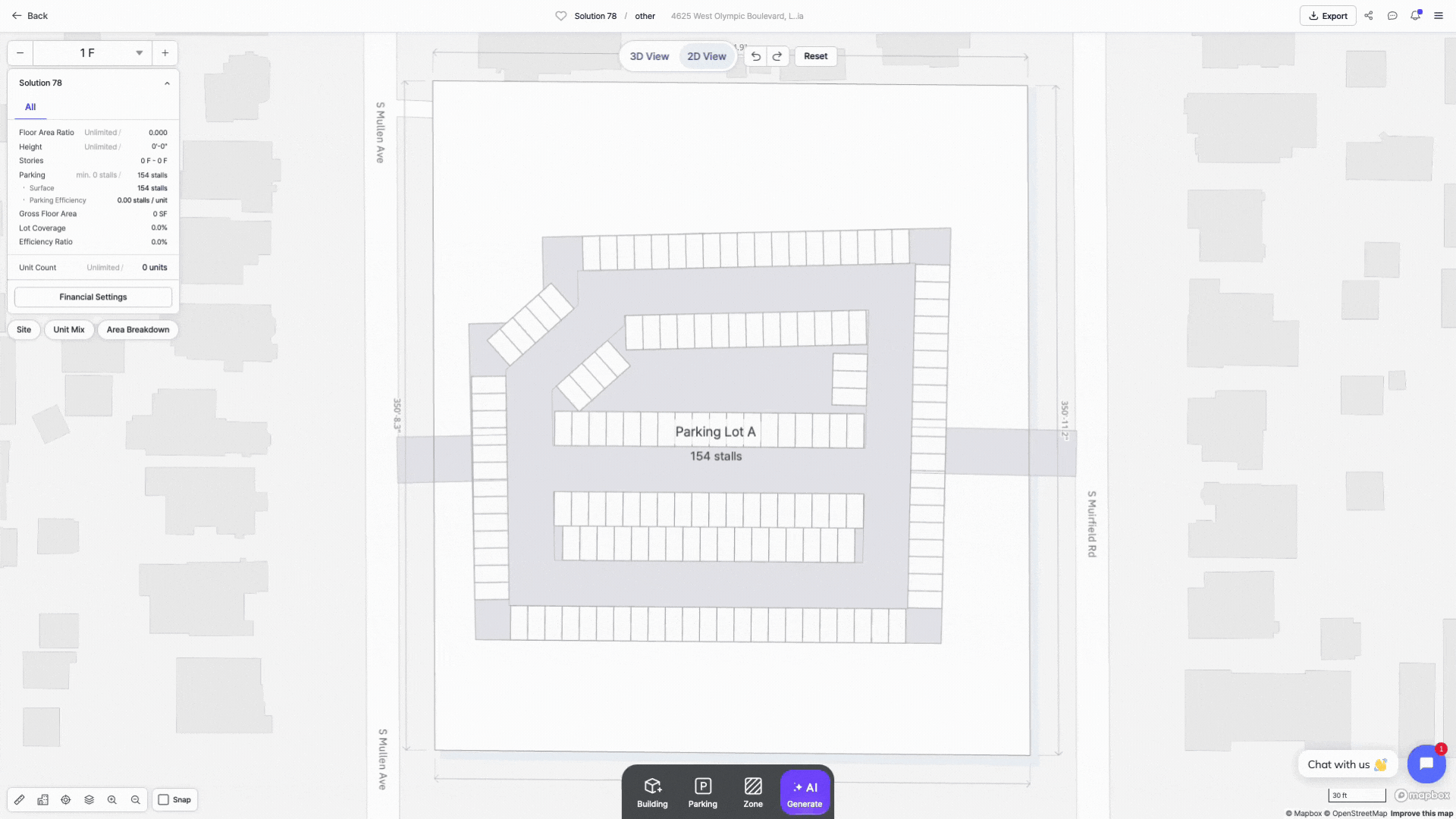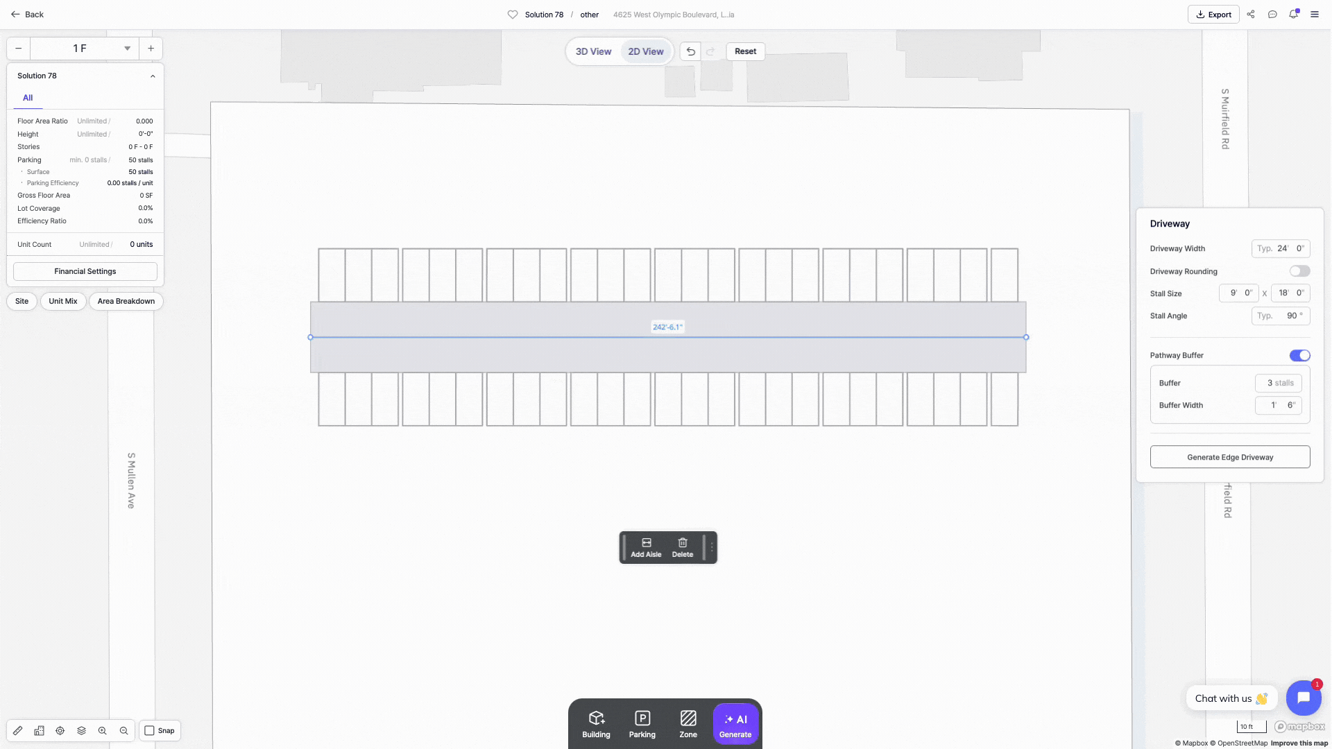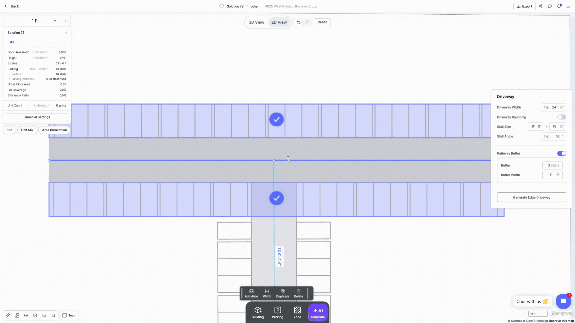 Zenerate offers surface parking layout options; Surface Parking Lot, and Driveway with/without Parking (Stalls). You can instantly generate a parking layout by drawing a lot boundary or draw driveways with parking stalls to make your own layouts with drag-and-drop editing tools.